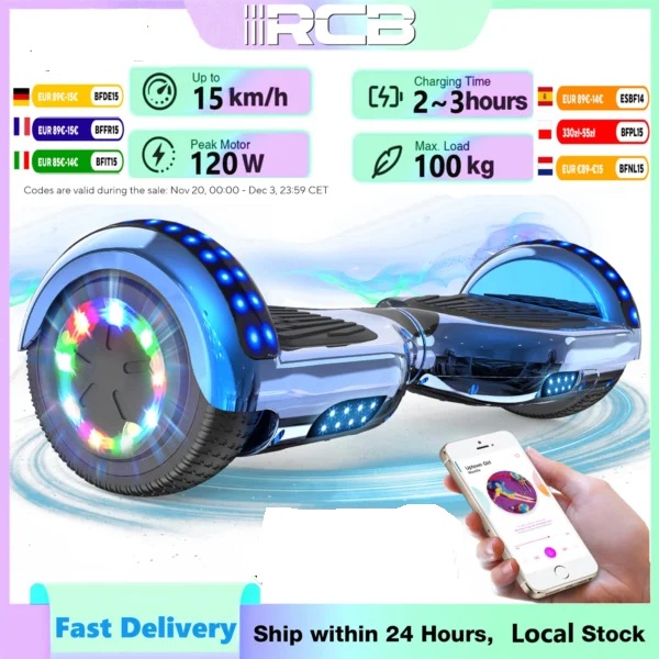 Das RCB Hoverboard 6,5 Zoll bietet Fahrspaß pur für Kinder & Jugendliche. Mit leistungsstarkem Motor, Bluetooth-Lautsprechern, bunten LED-Lichtern und automatischer Selbstbalancierung ist es ideal für Einsteiger. Sicher, stylisch und perfekt für den Alltag oder als Geschenk.